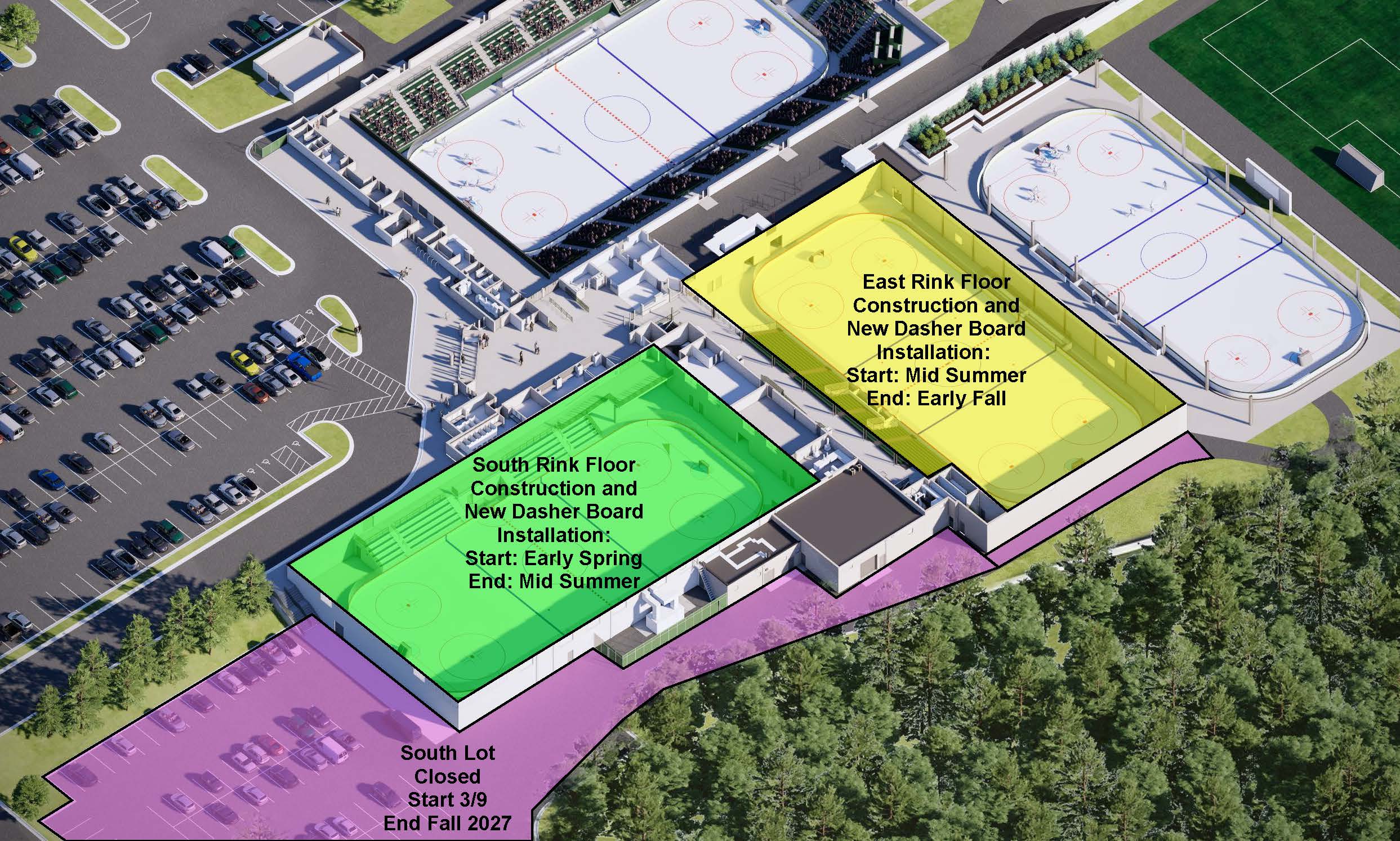 With construction beginning, the Braemar Arena south parking lot is now closed to the public through the fall of 2027. The main upper lot will remain open.