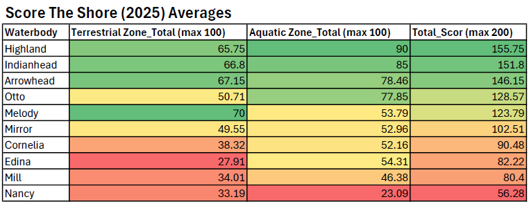 Share Score The Shore Evaluations Available on Facebook Share Score The Shore Evaluations Available on Twitter Share Score The Shore Evaluations Available on Linkedin Email Score The Shore Evaluations Available link'Score The Shore' Evaluations were completed at several waterbodies this past summer. The goal of the initiative was to evaluate shoreland health and habitat conditions to establish the current state of shoreland health and identify opportunities for protection and restoration.